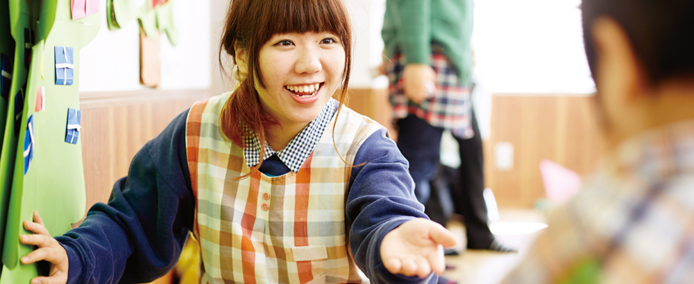 We develop human resources who can play active roles in the field, and students a aiming to obtain qualifications for nursery teacher for children aged 0 to 18 and for kindergarten teachers involved in early childhood education.