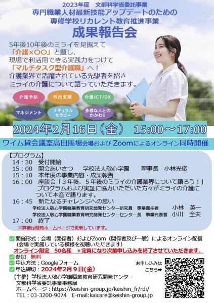 令和5年文部科学省委託研究事業「専門職業人材最新技能アップデートのための専修学校リカレント教育推進事業 成果報告会 座談会詳細決定‼   2024年2月16日(金)に行われる、