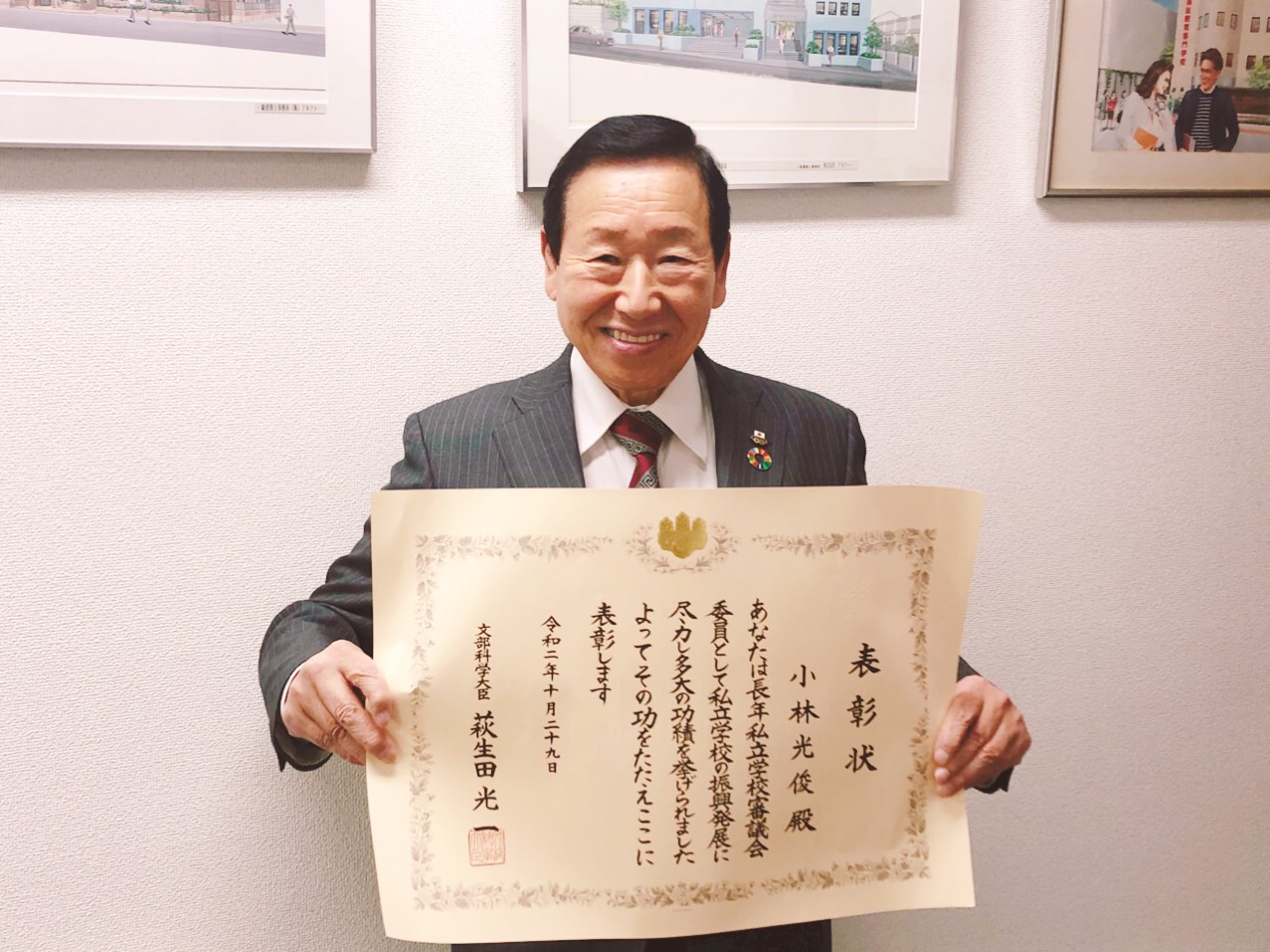 今回、私学教育の振興と健全な発展に資する顕著な功績が認められ「私立学校審議会委員功労者」として、文部科学大臣表彰を受けました。